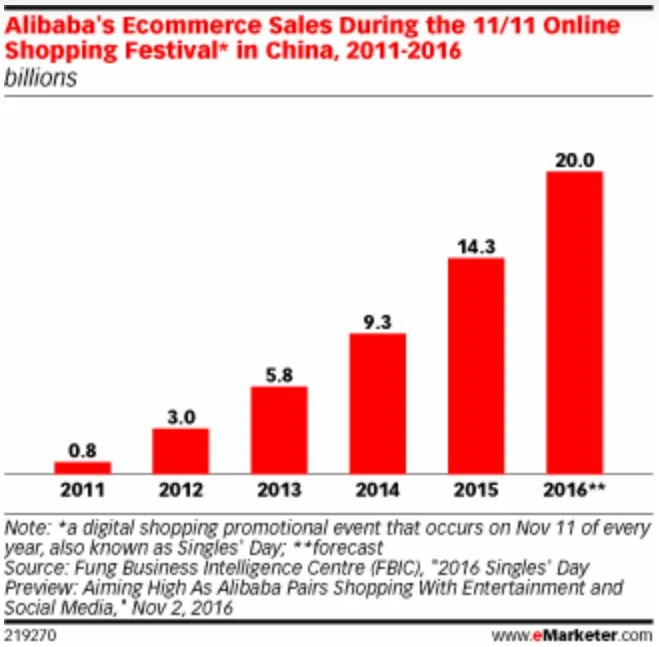 Im letzten Jahr wurden über Alibabas E-Commerce-Plattformen am Singles Day Waren im Wert von 14 Milliarden Dollar umgesetzt. In den Anfängen des Shopping-Tages waren es nur 27 Händler mit denen der E-Commerce-Riese kooperierte. Heutzutage sind es bereits über eine Million. Hinzu kommen bis zu 440 Millionen monatlich aktive Nutzer. Bei diesen Zahlen kann keine andere E-Commerce-Plattform mithalten. Laut den Marktforschern von eMarketer werden dieses Jahr 20 Milliarden Dollar durch Alibaba umgesetzt. Das würde einem Wachstum von 40 Prozent gegenüber dem Vorjahr bedeuten.