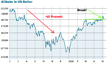 Die "Schüchternheit" bei Alibaba hat einen denkbar einfachen Grund: Die Börse hat nicht vergessen, welche Kursauswirkungen der Handelsstreit 2018 hatte. Ab Juni rauschte das Papier um 40 Prozent in die Tiefe und erholte sich erst, als sich die Anzeichen für ein Abkommen zwischen den Ländern mehrten.