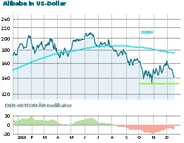 Noch im November hatte es den Anschein, als könnte die Aktie aus dem im Sommer begonnenen Abwärtstrend nachhaltig ausbrechen. Am 3. Dezember markierte das Papier von Chinas größtem E-Commerce-Konzern bei 168 Dollar ein 10-Wochen-Hoch. Das Niveau entsprach gegenüber dem Ende Oktober markierten Tief bei 138 Dollar einem Kursplus von mehr als 20 Prozent.