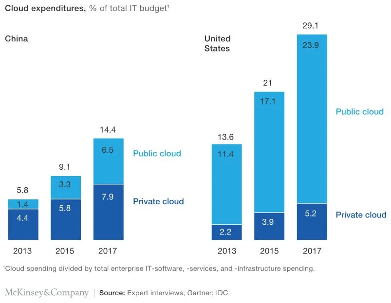 Lange Zeit zierten sich chinesische Unternehmen in die Cloud zu investieren – doch langsam beginnt sich dies zu ändern. Bis 2020 sollen rund 20 Prozent der gesamten IT-Ausgaben in die Cloud fließen. Nicht zuletzt weil die Regierung im Fünf-Jahres-Plan die Cloud als wichtige Technologie benennt und durch die staatlichen Telekommunikationskonzerne massiv investiert.