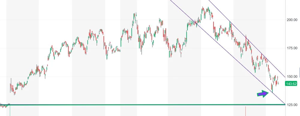 Kühle Köpfe schauen auf den Chart und suchen nach möglichen Unterstützungsmarken. Bei Alibaba sind die derzeit dünn gesät, nenneswerte Auffangniveaus finden sich auf Höhe der Marke (Pfeil) bei 135,14 Dollar, dem Tief aus der vorwergangenen Woche. Bricht das Papier durch diese Marke, könnten die Bären ein Fass aufmachen.