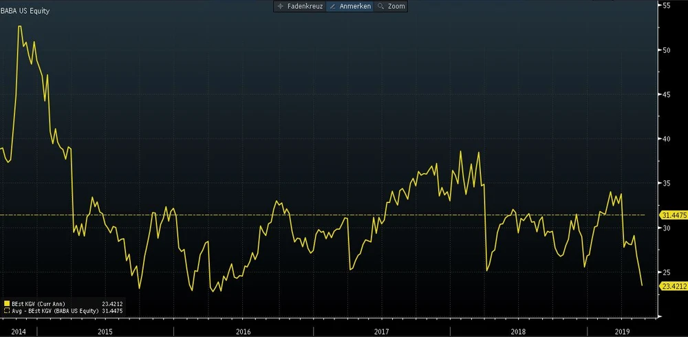 Alibaba schloss am Freitag etwas leichter bei 155 Dollar und damit auf dem niedrigsten Niveau seit Ende Januar. Binnen drei Wochen – seitdem der Handelsstreit zwischen den USA und China erneut hochgekocht ist – büßte die Aktie nahezu 20 Prozent an Wert ein.