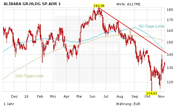Von dieser Wertentwicklung kann die Mutter nur träumen. Handelskrieg und schwächelnde China-Konjunktur drückten den Wert der Alibaba-Aktie deutlich nach unten. Zum Monatsanfang konnte die Aktie zwar eine Gegenbewegung verzeichnen. Doch die charttechnischen Trends sprechen noch immer gegen einen Neueinstieg bei Alibaba. Der Abwärtstrend ist intakt und die 200-Tage-Linie ist rund 18 Prozent entfernt – zudem liegt dazwischen noch der ausgeprägte Widerstandsbereich bei 170 Dollar.