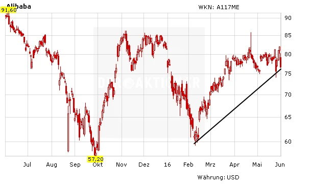 Der AKTIONÄR hält an seiner Kaufempfehlung für Alibaba fest. Mit dem gestrigen Kursabsturz ist die Aktie der 200-Tagelinie bei 73,93 Dollar zwar näher gekommen, der Aufwärtstrend wurde aber nicht gebrochen. Bereits investierte Anleger sollten ihre Position halten, Neueinsteiger können die Rücksetzer nutzen, um auf den Zug aufzuspringen.