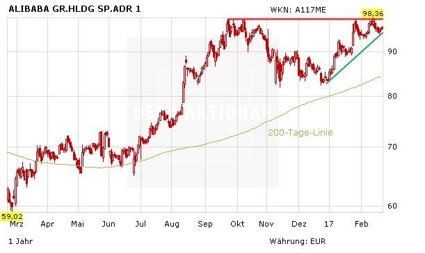 Alibaba wächst weiter. Auch der Aktienkurs legt im neuen Jahr um 17 Prozent zu. Sollte der Widerstand im Bereich des Allzeithochs bei 98,36 Euro fallen, ist der Weg nach oben frei. DER AKTIONÄR bleibt bei seinem Kursziel von 110 Euro.