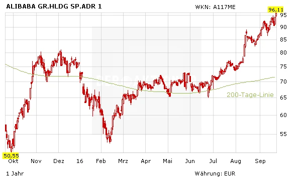Die Aktie bewegt sich nur noch 13 Prozent unter dem Allzeithoch von 120 Dollar. Bald könnte diese Marke wieder erreicht werden. Allein in der letzten Woche legte Alibaba um 4 Prozent zu. Die Analysten der Banken UBS und STIFEL hoben am Donnerstag ihre Kursziele auf 124 Dollar beziehungsweise auf 125 Dollar an. Beide Häuser sehen Alibaba über dem Allzeithoch. Diese Anpassungen könnten den Kurs weiter antreiben.