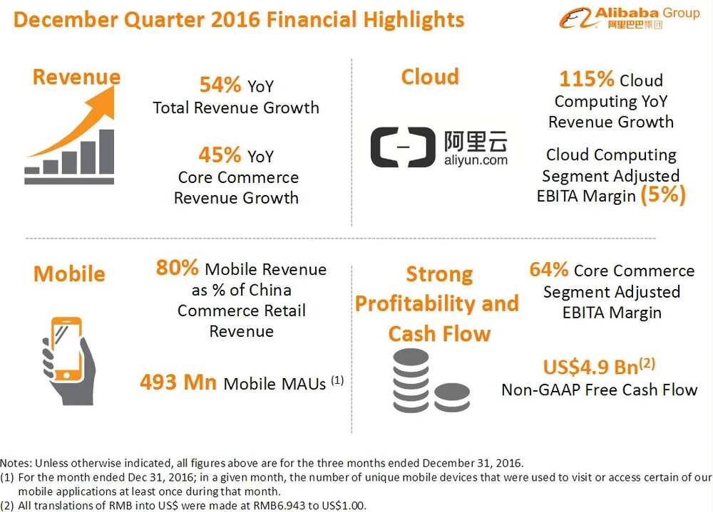 Das Cloud-Geschäft Alibabas wuchs gegenüber dem Vorjahr um 115 Prozent auf 254 Millionen Dollar. Die Anzahl der zahlenden Kunden stieg um 114.000 auf 765.000. Das anhaltend hohe Investment im Cloud-Segment sorgte aber für einen Verlust von 13 Millionen Dollar. Alibaba plant seit November 2016 neue Server-Zentren in Dubai, Tokio, Sydney und Frankfurt.