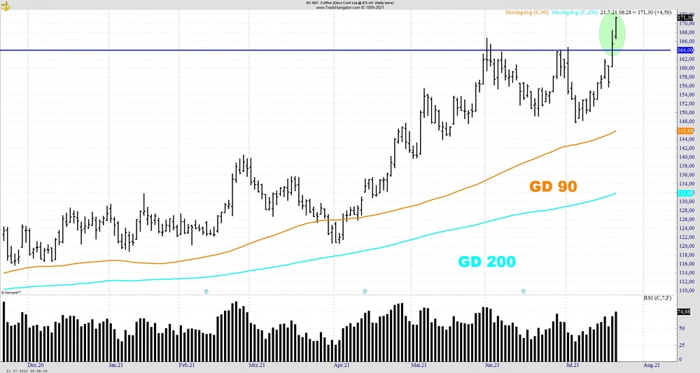 Nach dem Jahreshoch am 1. Juni bei 166,75 Cent ging es für den Kaffee-Future erst einmal nach unten. Ein zweiter Ausbruchsversuch scheiterte. Alle guten Dinge sind drei: Am heutigen Mittwoch hat der Future bei 170,75 ein neues Jahreshoch erreicht, Schlusskurse auf diesem Niveau könnten Anschlusskäufe nach sich ziehen.