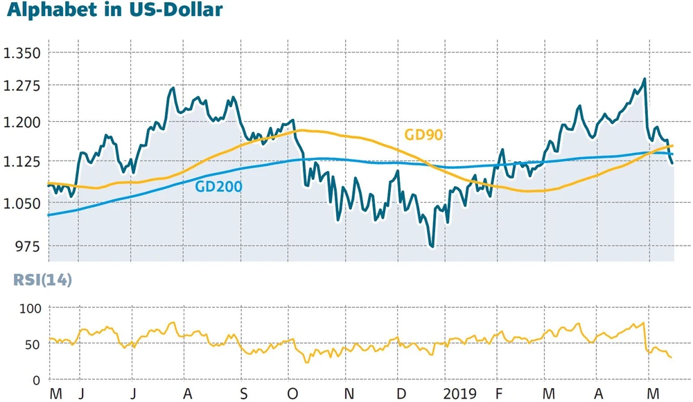 Die 200-Tage-Linie bei 1.137 Dollar und die 90-Tage-Linie bei 1.139 Dollar wurden gerissen. Der Relative-Stärke-Index notiert mit 31 Punkten nahe dem überkauften Bereich. Charttechnisch positiv: Ein RSI von 28 markierte bei der Alphabet-Aktie oft eine Umkehr des kurzfristigen Abwärtstrends.