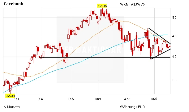 Nach der Korrektur – beschleunigt durch Warnungen vor einem Tech-Crash durch David Einhorn – scheint sich das Facebook-Papier zu fangen. Die jüngsten weißen Kerzen im Chart machen Hoffnung auf einen Rebound. Vorsichige Anleger warten vor einem Neueinstieg jedoch ab, bis das eingezeichnete Dreieck nach oben verlassen wird. Fundamental ist das Potenzial noch nicht ausgereizt, bis 2017 sinkt das KGV auf moderate 20. (siehe auch: „Zuckerberg: Blind oder genial?“)