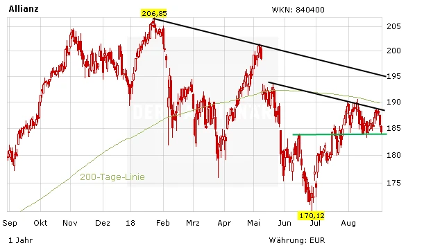 Dennoch hängt die Allianz-Aktie noch in einer technischen Widerstandszone. Erst wenn die 200-Tage-Linie (derzeit bei 189,90 Euro) überwunden wird, dürfte auch der seit Januar 2018 intakte Abwärtstrend bei etwa 195 Euro fallen. Eine technische Unterstützung liegt derzeit bei 184 Euro. Darunter bietet ein längerfristiger Aufwärtstrend noch eine Stütze. Die entsprechende Linie verläuft derzeit bei 175 Euro. Fazit: Die Allianz-Aktie ist weiterhin haltenswert. Für langfristig orientierte Anleger könnte sich auf dem ermäßigten Niveau auch ein Nachkauf lohnen.