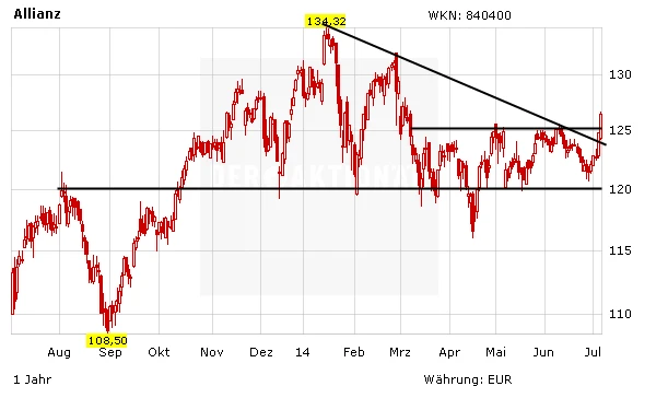 Auch DER AKTIONÄR bleibt für die Titel der Allianz zuversichtlich gestimmt. Aufgrund der nach wie vor günstigen Bewertung mit einem KGV von 9 und einer Dividendenrendite von mehr als vier Prozent ist der DAX-Wert weiterhin attraktiv. Zudem ist mit dem Ausbruch über die 125 Euro ein massiver Widerstand überwunden worden. Der Weg dürfte nun bis in den Bereich von 133 Euro frei sein. Der Stoppkurs sollte bei 115 Euro belassen werden.
