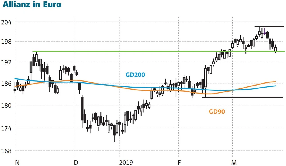 Die Konsolidierung am Gesamtmarkt ist auch an der Allianz nicht spurlos vorübergegangen. Kurse oberhalb von 200 Euro waren leider nur von kurzer Dauer. Zum Start in die neue Handelswoche drohte die Aktie unter eine wichtige charttechnische Unterstützung zu fallen. Der Test besagter Haltemarke verlief aber bislang erfolgreich.