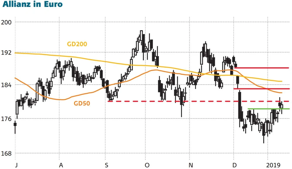 Vorbörslich notiert die Allianz oberhalb des wichtigen Widerstands von 180 Euro. Sollte die Aktie darüber und über dem GD38 (180,42 Euro) aus dem Handel gehen können, wäre das ein frisches Kaufsignal. Im Anschluss könnte der DAX-Wert das Gap bei 183,06 Euro schließen und danach den Weg in Richtung 200-Tage-Linie einschlagen. Die verläuft bei 184,80 Euro.