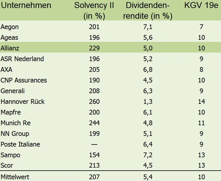 Was die Dividende betrifft, erwarten die Analysten bei der Allianz für 2018 eine Ausschüttung von 8,80 Euro pro Aktie. Dies entspricht einer Dividendenrendite von 5,0 Prozent und damit einem unteren Mittelfeldplatz in Europa.