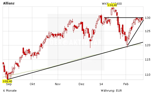 In einem positiven Marktumfeld kann die Allianz-Aktie gut zulegen. Das DAX-Unternehmen ist mit einem einstelligen KGV weiterhin günstig bewertet. Ein Kurs von 160,00 Euro wäre durchaus gerechtfertigt. Der Stoppkurs sollte im Bereich bei 102,00 Euro gesetzt werden.