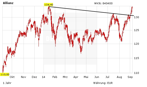Deutschlands größter Versicherer befindet sich auf einem guten Weg. Die Allianz-Aktie notiert unmittelbar unterhalb des Mehrjahreshochs bei 134,40 Euro. Das Ende der Fahnenstange muss hier allerdings noch lange nicht erreicht sein. Die Commerzbank empfiehlt den DAX-Titel nach Übernahmegerüchten weiterhin zum Kauf.