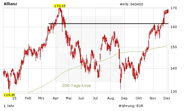 Schon vor Tagen hatte DER AKTIONÄR eine Fortsetzung der Aufwärtsbewegung als wahrscheinlich angesehen. Nach dem Sprung über das Jahreshoch von 170,15 Euro würde der nächste Widerstand bei 180,29 Euro, dem Hoch aus der Finanzkrise, liegen.