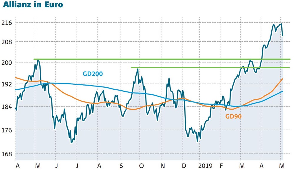 Die Auswirkungen des Handelsstreits auf die Allianz mögen gering sein, doch in einem schwachen Umfeld wird auch die Aktie des Versicherers nicht mit üppigen Kursgewinnen herausragen. Zudem wird am Donnerstag die Dividende von 9,00 Euro vom Aktienkurs abgezogen und damit das Chartbild weiter belasten.