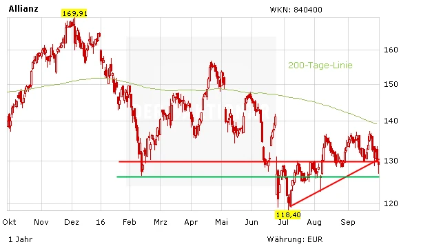 Mit der Beteiligung an MoneyFarm baut die Allianz das zukunftsträchtige Geschäft im Fintech-Bereich weiter aus. Dem Kurssturz der Deutsche-Bank-Aktien konnten sich auch die Titel der Allianz aber nicht entziehen. Der seit Juli gültige Aufwärtstrend wurde im Bereich 130,00 Euro nach unten verlassen. Die nächste Unterstützung wartet bei 126,50 Euro. Die Dividendenrendite von aktuell 5,7 Prozent tröstet über die Verluste hinweg, das KGV von 9 ist günstig. Der Titel ist weiterhin ein Kauf mit einem Ziel von 185,00 Euro. Den Stopp setzt DER AKTIONÄR bei 115,00 Euro.