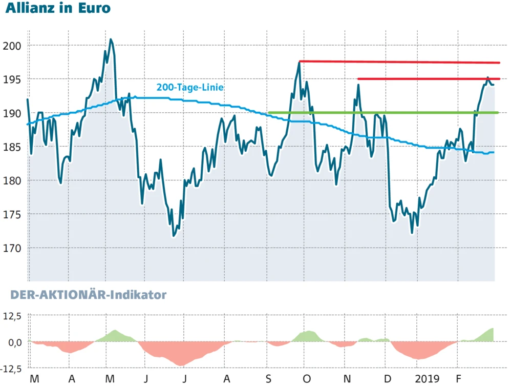 Charttechnisch könnte der Allianz-Aktie aber demnächst die Luft ausgehen. Nach der kleinen Erholungssrallye der vergangenen Monate sind die Anteilsscheine zuletzt auf über 195 Euro gestiegen und haben somit das Hoch von November überschritten. Dennoch konnte sich dieser Ausbruch bis dato nicht bestätigen. Auf kurze Sicht könnte die Aktie ein Zwischenhoch markiert haben.