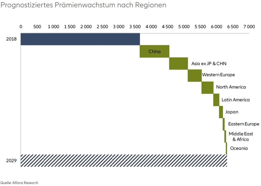 In den nächsten zehn Jahren erwarten die Experten, dass das Wachstum der weltweiten Versicherungsprämien von 3,3 Prozent im Jahr 2018 auf rund fünf Prozent ansteigen wird, wobei China die Pace machen wird. Für 2029 rechnet Allianz Research weltweit mit einem Gesamtvolumen an Versicherungsprämien von 6,326 Billionen Euro, letztes Jahr waren es 3,66 Billionen.