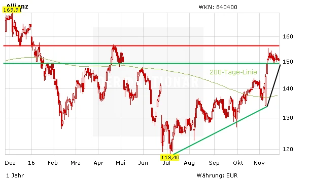 Wie der DAX verharren die Aktien der Allianz derzeit in Wartestellung. Sobald das Italien-Referendum überstanden ist, spricht nichts gegen steigende Kurse. Kurzfristig kann es bis in den Bereich von 156 Euro gehen. Selbst bei einem negativen Votum: Die Dividendenrendite von derzeit 4,9 Prozent und die Aussicht auf ein Aktienrückkaufprogramm im nächsten Jahr begrenzen das Abwärtspotenzial. Der AKTIONÄR sieht den fairen Wert der Allianz bei 185 Euro, ein Stopp bei 115 Euro sichert ab.