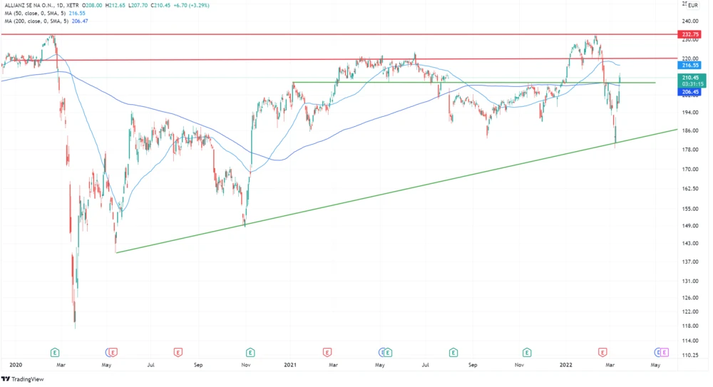 Kurz bevor die Allianz-Aktie das Vor-Corona-Hoch bei knapp 233 Euro knacken konnte, ging es für sie ab Mitte Februar steil bergab. Erst an der langfristigen Aufwärtstrendlinie bei 178 Euro fand die Abwärtsbewegung ihr Ende. Von dort setzte die Aktie zum Rebound an.