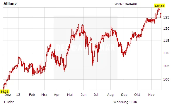 Die Experten der Prior Börse verweisen auf Analystenschätzungen, wonach der Gewinn der Allianz SE von 13,25 Euro je Aktie in diesem auf 13,65 Euro im nächsten Jahr steigen dürfte. Das entspräche einem günstigen einstelligen KGV. Zudem beträgt das KBV lediglich 1,2. Die Ausschüttung dürfte von 4,50 auf 5,25 Euro pro Anteil erhöht werden, was einer für einen so stabilen Konzern sehr hohen Dividendenrendite von 4,1 Prozent gleichkäme. Mit einer Solvabilitätsquote von 177 Prozent ist die Bilanz sehr stark (Anmerkung der Redaktion: Unter Solvabilität versteht man Eigenmitteln, also freies, unbelastetes Vermögen.). Der weltweit tätige Konzern hat, im Gegensatz zu vielen Wettbewerbern, einen guten Ruf und stets eine Dividende bezahlt. Vorstandsvorsitzender Michael Diekmann führt das Unternehmen mit den drei Säulen Erstversicherung, Finanzdienstleistungen, Vermögensverwaltung erfolgreich durch gute und schlechte Zeiten, in denen die Allianz auch schon Federn lassen musste. Doch seit dem Verlust von 2,2 Milliarden Euro im Jahr 2008 geht es beständig aufwärts. Im vergangenen Jahr verdiente der Konzern 5,5 Milliarden Euro. Der Aktienkurs hat demnach Luft nach oben.