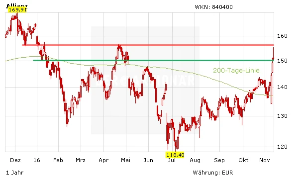 Die Berufung von Ex-Gesundheitsminister Daniel Bahr in den Vorstand der Allianz Krankenversicherung ist ein kluger Schachzug, um den Erfolg der Sparte langfristig abzusichern. Mit einem KGV von 10 und einer Dividendenrendite von 4,8 Prozent ist die Aktie fundamental günstig bewertet. Durch die jüngste Rallye nach dem Wahlsieg von Donald Trump in den USA hat sich das Papier über 150 Euro stabilisiert. Ob Anleger jetzt noch zugreifen sollten bei der Allianz, erfahren Sie im neuen AKTIONÄR.