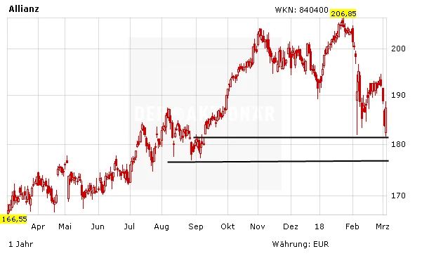 Das Jahr 2018 startete für die Allianz turbulent – das Sturmtief „Frederike“ wird laut Pressemitteilung rund 182 Millionen Euro verschlingen. Nichts desto trotz geht die Allianz von einer stabilen Geschäftsentwicklung aus. Die Papiere des Versicherers bleiben ein Basisinvestment und locken außerdem mit einer gesteigerten Dividende von 8,00 Euro je Aktie und damit einer Rendite von 4,2 Prozent. Investierte Anleger geben keine Stücke aus der Hand und sichern sich mit einem Stopp bei 170,00 Euro ab.