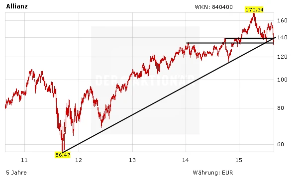Im Zuge des gestrigen Crashs rutschte auch die Langzeit-Empfehlung des AKTIONÄR (seit Juli 2012) unter den mehrfach nachgezogenen Stoppkurs bei 135 Euro. Anleger, welche die Allianz-Aktie nun verkauft haben, sollten zunächst an der Seitenlinie verharren und eine Bodenbildung beziehungsweise eine Trendwende abwarten.