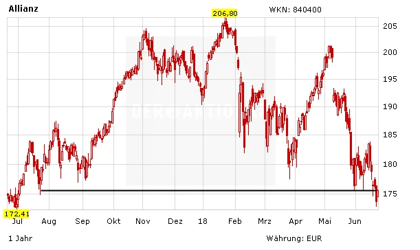 Die positiven Meldungen über den aktuell in der Testphase befindlichen mobilen Bezahlservice „Allianz-Prime“ wurden zügig übertönt. Gerüchte über einen Stellenabbau von mindestens 5000 Arbeitsplätzen trübten die Stimmung im Wochenverlauf – und auch das Chartbild. Bestätigt wurden die Gerüchte jedoch nicht. Als „völlig aus der Luft gegriffen“ bezeichnete ein Sprecher der Allianz am Donnerstag die angeblichen Rationalisierungsmaßnahmen.