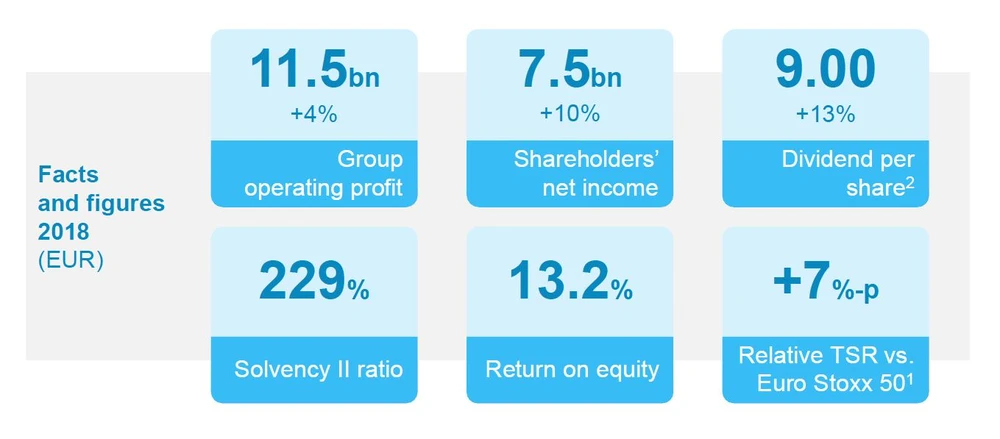 Der interne Umsatz der Allianz ist 2018 im Vergleich zum Vorjahr um 6,1 Prozent geklettert, auf Konzernebene bedeutet das ein Plus von 3,5 Prozent auf 130,6 Milliarden Euro. Der Jahresüberschuss stieg sogar um 9,7 Prozent auf 7,5 Milliarden Euro. Beim operativen Ergebnis erreichte die Allianz mit 11,5 Milliarden Euro das obere Ende des Zielkorridors. Dank der starken Entwicklung soll die Dividende um 12,5 Prozent auf 9,00 Euro je Aktie erhöht werden.