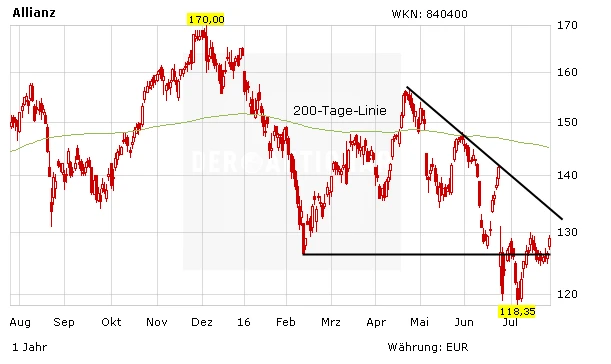 Die charttechnische Situation hat sich bei der Allianz zwar merklich verbessert, ein starkes Kaufsignal hat die Aktie aber noch nicht generiert. Dieses würde erfolgen, wenn der Abwärtstrend im Bereich 134 Euro durchbrochen wird. Ein noch stärkeres Kaufsignal wäre freilich der Ausbruch über die 200-Tage-Linie (140 Euro). Investierte Anleger bleiben dabei.