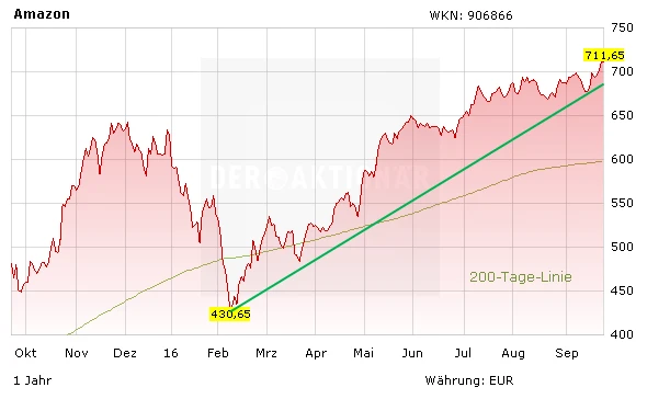 804,70 Dollar – so der Kurs der Amazon-Aktie zum Handelsschluss am Donnerstag. Damit hat die Aktie den Sprung auf ein neues Allzeithoch geschafft. Noch im Februar diesen Jahres stand die Aktie bei 482,07 Dollar – mit dem gestrigen Ausbruch über 800 Dollar ist die Amazon-Aktie innerhalb von sieben Monaten um über 66 Prozent gestiegen.