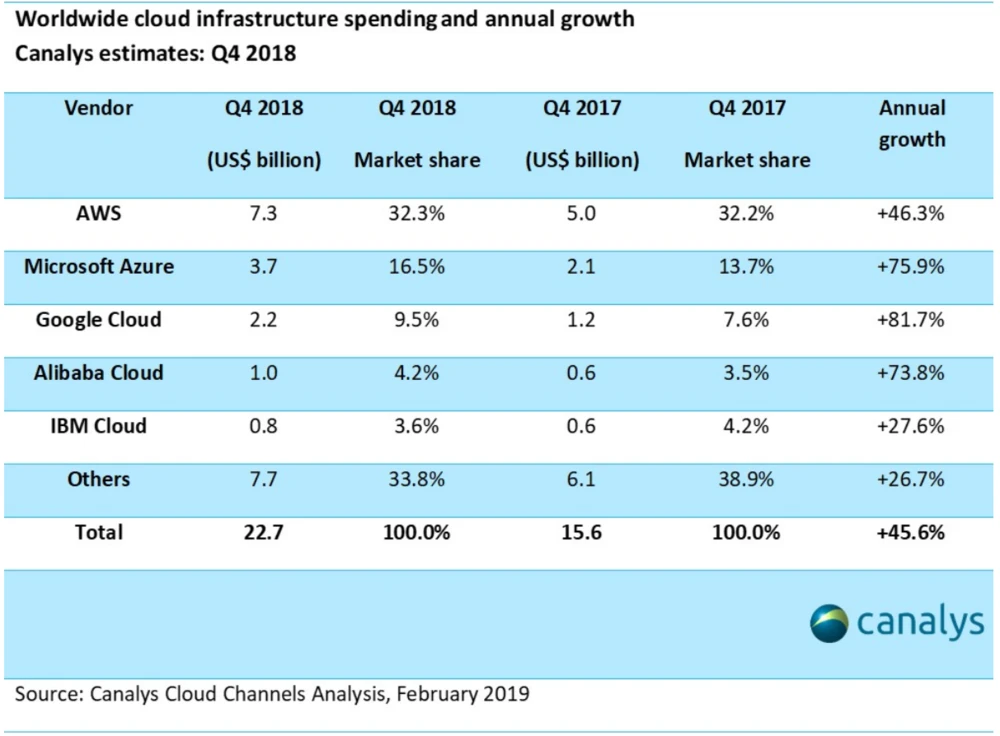 Laut der Studie hatte Amazons AWS nach dem vierten Quartal 2018 einen Marktanteil von über 32 Prozent. Mit großem Abstand folgen Microsofts Azure (16,5 Prozent) und schließlich auf dem dritten Platz die Google Cloud mit 9,5 Prozent ein.