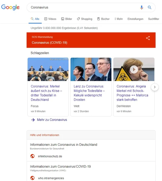Durch das Coronavirus hat sich das aber geändert. Sucht man bei Google zum Beispiel nach „Coronavirus“, wird einem ein auffälliger Warnhinweis angezeigt.