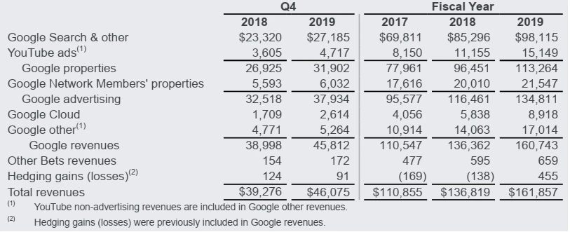 Insgesamt konnte Alphabet im Q4 2019 einen Gewinn je Aktie von 15,35 Dollar erzielen – ein Plus von 20 Prozent gegenüber dem Vorjahresquartal. Analysten hatten lediglich mit einem Ergebnis von 12,53 Dollar pro Papier gerechnet. Der Umsatz kletterte auf 46,08 Milliarden Dollar (Zuwachs um 17 Prozent gegenüber Q4 2018). Hier hatten die Analysten jedoch mehr erwartet (46,94 Milliarden Dollar).