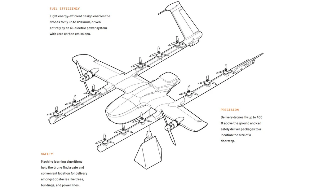 Die Drohnen haben eine Spannweite von einem Meter, wiegen fünf Kilogramm, tragen Lasten bis zu 1,5 Kilogramm und haben eine Reichweite von 20 Kilometern. Gesteuert werden die Drohnen vollständig automatisiert durch ein sogenanntes Unmanned Traffic Management (UTM).