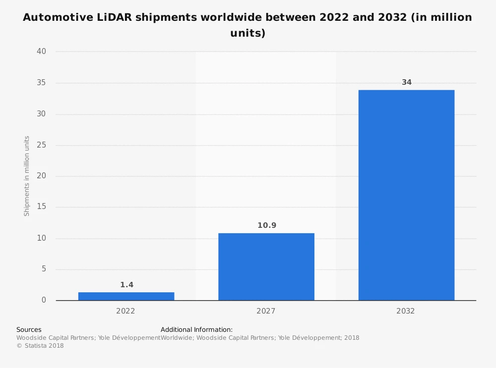 Die Wachstumsraten des Lidar-Marktes sind beeindruckend. Die Geschäftsführung von Velodyne, einem führenden Lidar-Hersteller, geht davon aus, dass sich der Umsatz in diesem Jahr auf eine Milliarde Dollar verdoppeln kann. Ein aussichtsreicher Markt, der nicht nur die Begehrlichkeiten von Waymo weckt sondern auch zahlreiche Startups wie Blackmore oder Luminar anzieht. Die langfristigen Aussichten sind ebenfalls vielversprechend, wie die Grafik unten zeigt.