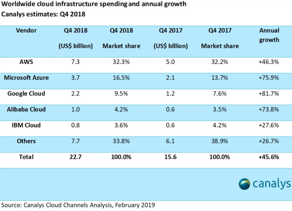 Google nimmt damit Schwung im Wettrennen auf dem Cloud-Markt gegen AWS von Amazon und Azure von Microsoft. Zwar veröffentlicht Alphabet nicht genau, wie hoch der Umsatz ist, den Google Cloud erwirtschaftet. Google selbst gibt nur einen groben Richtwert von über einer Milliarde Dollar Umsatz an. Laut den Marktforschern von Canalys kam Google damit auf einen Marktanteil von 7,6 Prozent, hinter Microsoft mit 13,7 Prozent und Amazon mit 32 Prozent.