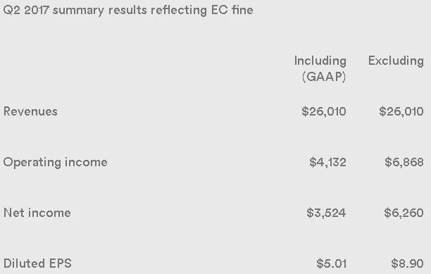 Grund für den massiven Gewinnrückgang war die Rekordstrafe von 2,74 Milliarden Dollar, (2,43 Milliarden Euro) welche die EU-Kommission gegen Google Ende Juni verhängte. Die Wettbewerbshüter kamen nach einer siebenjährigen Ermittlung zum Schluss, dass Google die eigenen ShoppingAngebote auf wettbewerbsverzerrende Art und Weise vor den Ergebnissen der Konkurrenz anzeigte. Steuerlich abgesetzt werden kann die Strafe nicht und schlägt sich daher in vollem Umfang auf Alphabets Netto-Gewinn nieder.