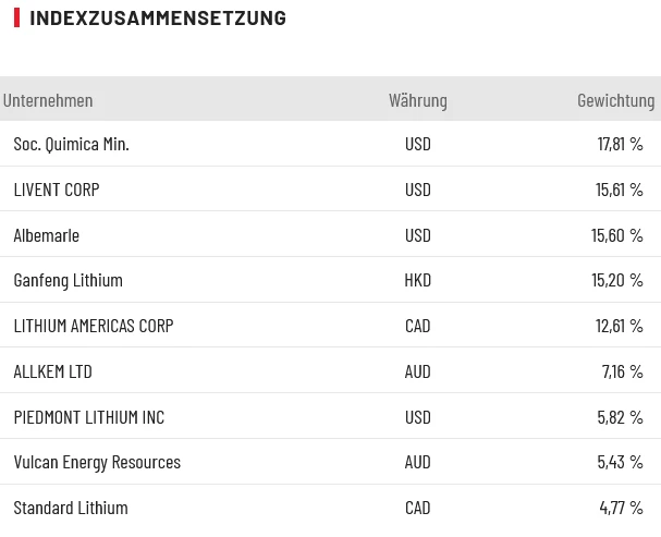 Aktuell weisen das kanadische Lithium-Unternhmen Standard Lithium und die deutsch-australische Gesellschaft Vulcan Energy Resources die niedrigste Gewichtung im Index auf. Vulcan Energy möchte im Oberrheingraben in großem Stil Lithium mittels Geothermie fördern und zu batterietauglichem Lithiumchlorid aufbereiten.