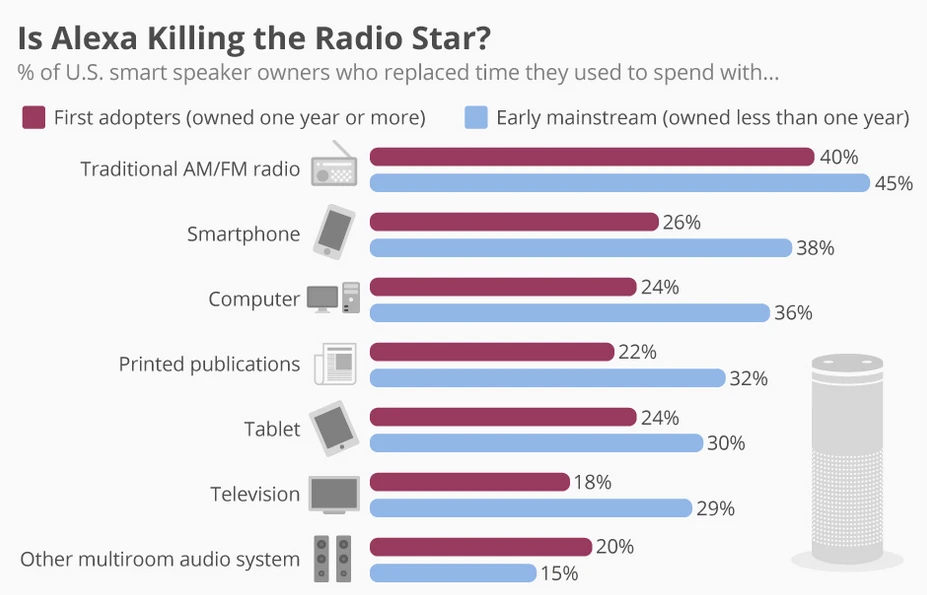Alexa ist seit einiger Zeit auf dem Vormarsch und verändert das Medienkonsumverhalten der Nutzer rapide. Laut dem aktuellen Smart Audio Report von NPR und Edison Research's lassen viele Smart-Speaker-Nutzer zum Beispiel das Radio aus, seitdem sie Alexa zu Hause haben. Bereits jetzt besitzen 43 Millionen Amerikaner einen Smart Speaker.