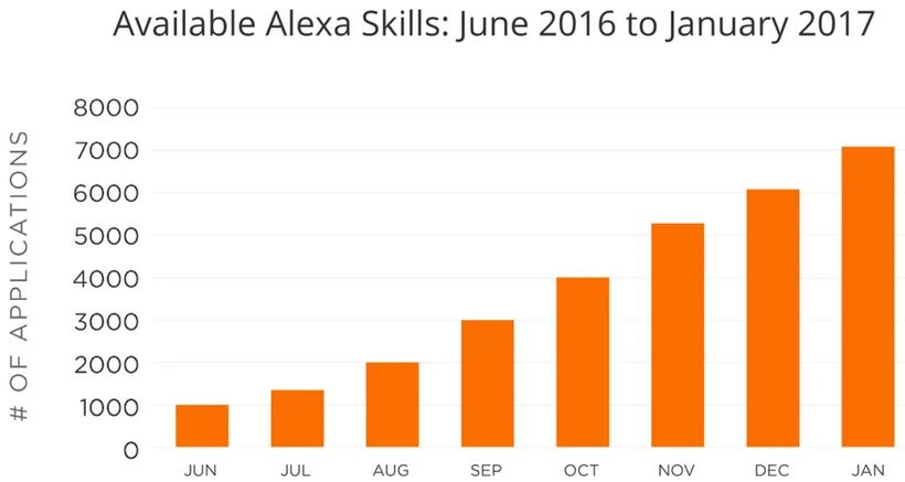 Die Zahl der verfügbaren Alexa Skills steigt rasant an, wie die Grafik unten verdeutlicht. Auch die Downloadraten der einzelnen Skills sind hoch. Was die Grafik nicht zeigt, ist, dass nach einer Woche nur drei Prozent der Nutzer den heruntergeladenen Skill noch nutzen.