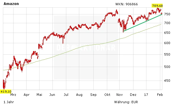 Ein lohnendes Geschäftsfeld, das ein weiterer Kurstreiber der Amazon-Aktie werden könnte. Aktuell setzen leicht schwächelnde Wachstumsraten und die schwache Prognose für 2017 Amazon unter Druck. Der langfristige Aufwärtstrend bleibt aber intakt. Nächste Hürde zum Kursziel von 1.000 Euro ist das Allzeithoch bei 789,68 Euro.