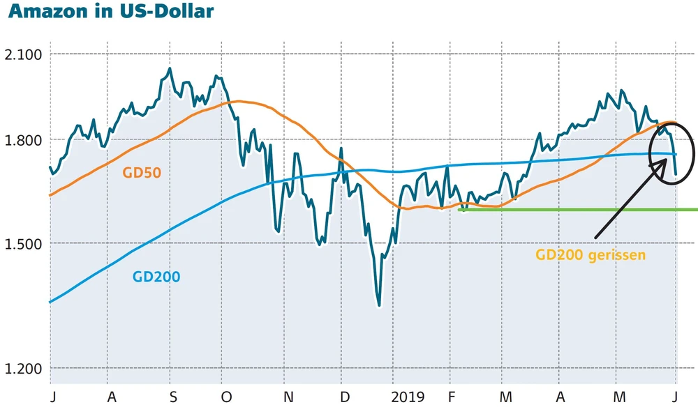 Zu viel Regulierung – für die Anleger ein Graus. Die Amazon-Aktie verlor infolge der Meldung 4,6 Prozent auf 1.692,69 Dollar. Pikant: Die Aktie ist unter die 200-Tage-Linie gefallen und hat damit eine wichtige Unterstützung gerissen.