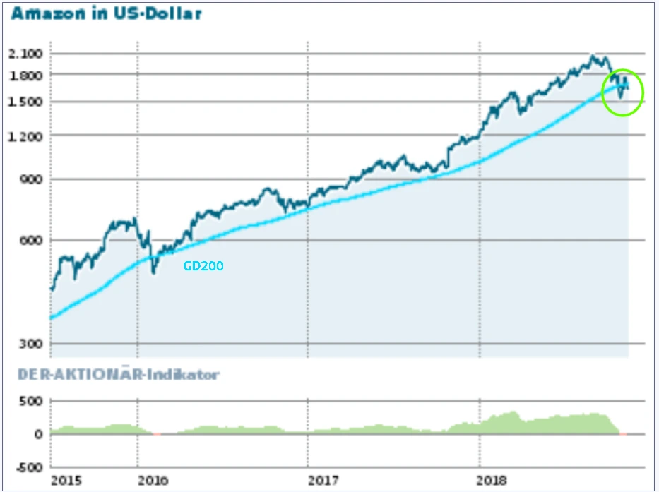 Die Erholung der Amazon-Aktie ist vorbei – vorerst zumindest. Im Sog des schwachen Marktumfelds verlor der Titel am Montag 4,4 Prozent auf 1.636,85 Dollar. Dadurch rutschte Amazon wieder unter die bedeutende 200-Tage-Linie.