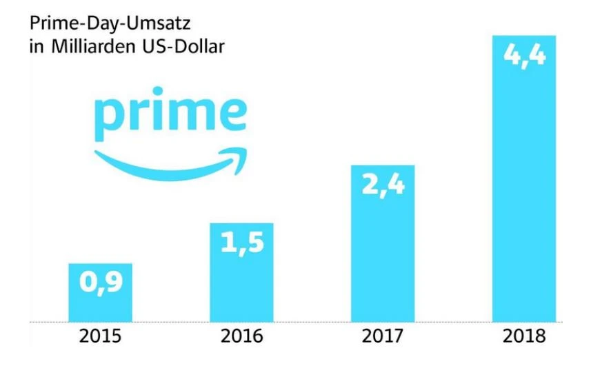 Der Umsatz am Prime Day ist in den vergangenen Jahren regelrecht explodiert. 2018 nahm Amazon weltweit am Prime Day 4,4 Milliarden Dollar ein – ein Wachstum im Vergleich zu 2017 von 83 Prozent.